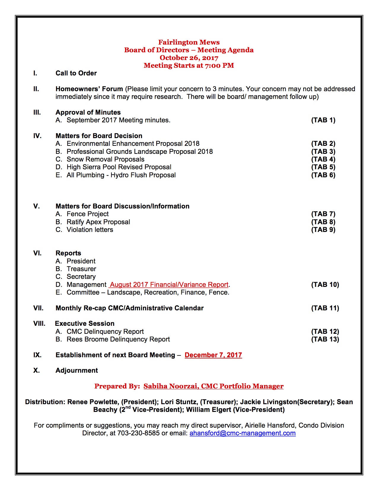 October Board Meeting Agenda October 18, 2017fairlingtonmews Share this: Click to share on X (Opens in new window) X Click to share on Facebook (Opens in new window) Facebook Like Loading...